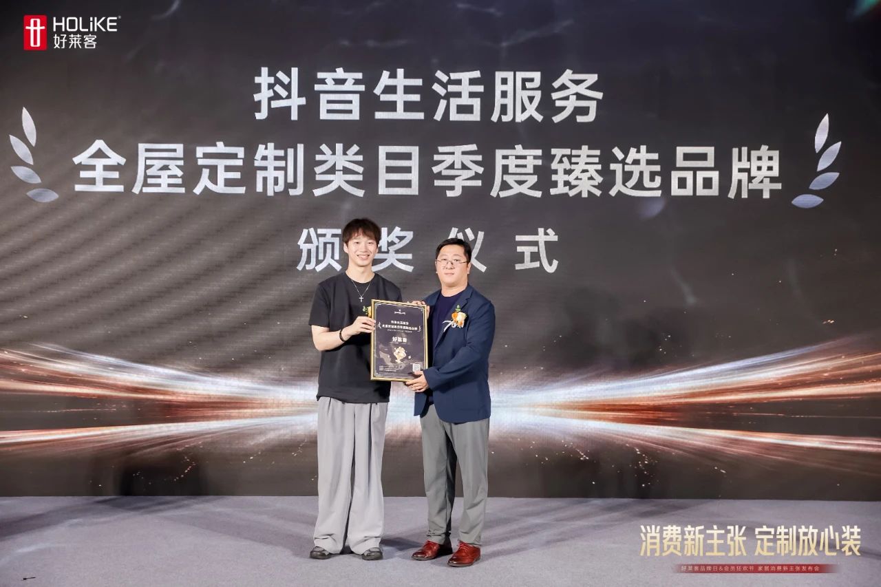 作为定制家居行业引领品牌,好莱客一直致力于破解制约消费的突出矛盾问题,着力营造安全可靠、让人放心的家居消费环境。好莱客凭借卓越的用户体验、超高的服务标准、硬核的产品实力,深受广大用户好评,在抖音平台获赞连连,在发布会现场更是荣获“抖音生活服务全屋定制类目季度臻选品牌”荣誉。